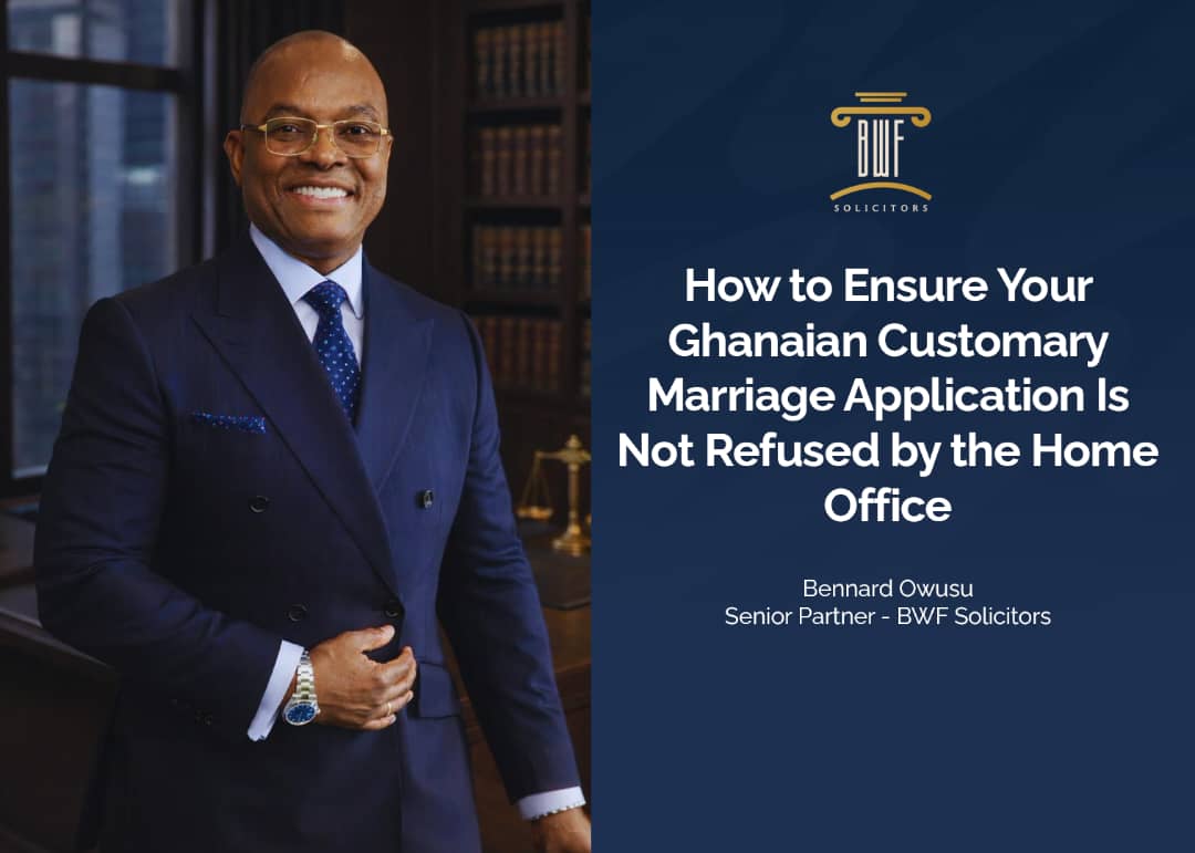 April 24, 2026 Bennard Owusu A Legal and Practical Guide Grounded in Ghanaian Law, UK Immigration Rules, and Case Law View more March 24, 2026 Bennard Owusu When a Child’s British Nationality Is Questioned View more March 13, 2026 Bennard Owusu A MAJOR SHIFT IN THE UK SETTLEMENT SYSTEM View more February 14, 2026 Bennard Owusu Proxy or Ghanaian Customary Marriage valid in UK View more October 17, 2024 Bennard Owusu What Happens if Your Sponsor’s Licence is Downgraded, Suspended or Revoked? View more August 31, 2024 Bennard Owusu Your Church “Wedding” is not a marriage as known under The Mariage Act 1949. View more May 20, 2024 Bennard Owusu A step-by-step guide to making a successful Sponsor Licence Application View more February 26, 2024 Bennard Owusu CARE AND SENIOR WORKERS (ALREADY ON THE ROUTE) CAN STILL BRING THEIR DEPENDENTS AFTER MARCH 2024. View more 1 2 3